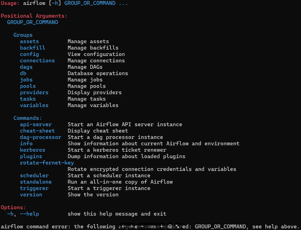 Airflow 3.x 버전부터는 기본 인증 매니저로 SimpleAuthManager가 설정되어 있어서 Flask-AppBuilder(FAB) 기반의 users, roles 등의 CLI 그룹이 로드 되지 않는다.