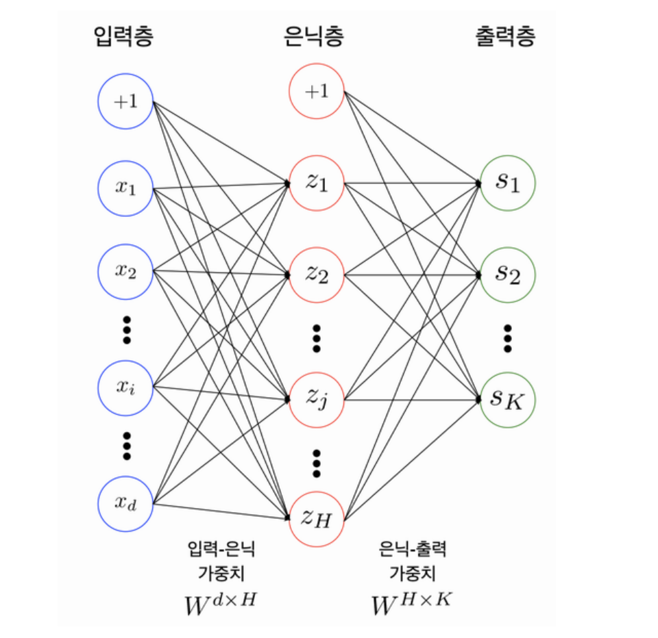 입력층-은닉층, 은닉층-출력층 사이에는 각 행렬이 존재한다.