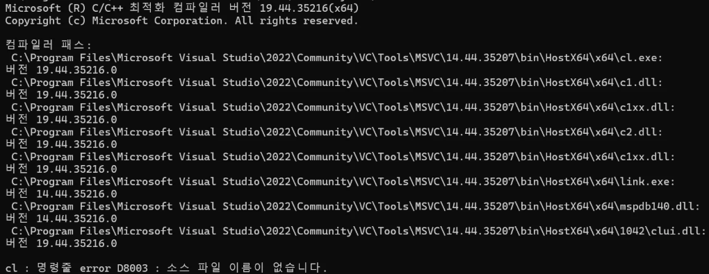 -> 마지막 줄은 cl 호출 시 항상 뜨는 안내성 에러라 무시해도 된다.