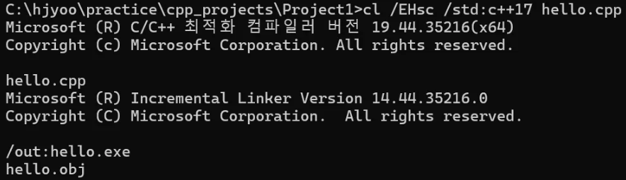 cl /EHsc /std:c++17 hello.cpp