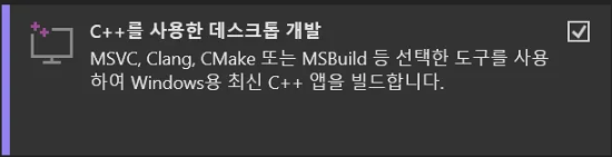 워크로드를 c++을 사용한 데스크톱 개발로 선택 후 설치를 이어가면 된다.