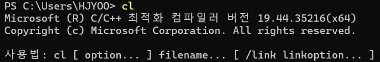 시작 메뉴에서 “x64 Native Tools Command Prompt for VS 2022”를 실행한 후 아래 명령어 입력 시 버전이 제대로 출력 되면 설치가 된 것이다.