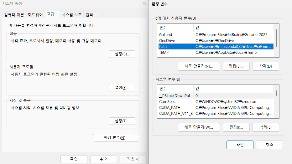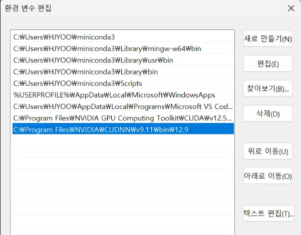 사용자 변수에서 Path를 클릭 후 편집을 눌러 cudnn와 CUDA 경로를 새로 만들기로 추가 해 주면 된다.