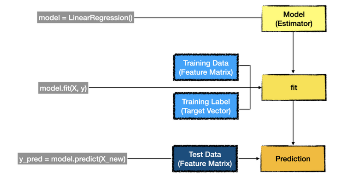 사이킷런에서 모델(Model)로 표현되는 클래스는 Estimator이며 Estimator 클래스의 메소드에는 fit()(훈련), predict()(예측)가 있다.