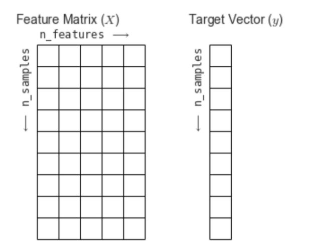 사이킷런에서 제공하는 데이터셋은 특성행렬(Feature Matrix)과 타겟벡터(Target Vector)로 NumPy의 ndarray, Pandas의 DataFrame, SciPy의 Sparse Matrix를 이용해 나타낼 수 있다.