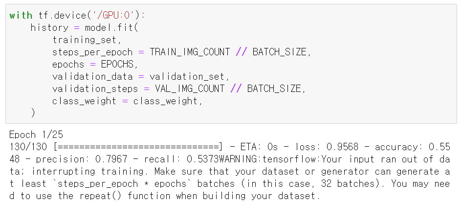 하지만 모델 학습을 하는 부분에서 WARNING:tensorflow:Your input ran out of data; interrupting training. 오류가 출력되면서 epoch1에서만 validation 데이터셋에 대한 결과가 생성 되었고 epoch2부터는 생성이 되지 않았다.