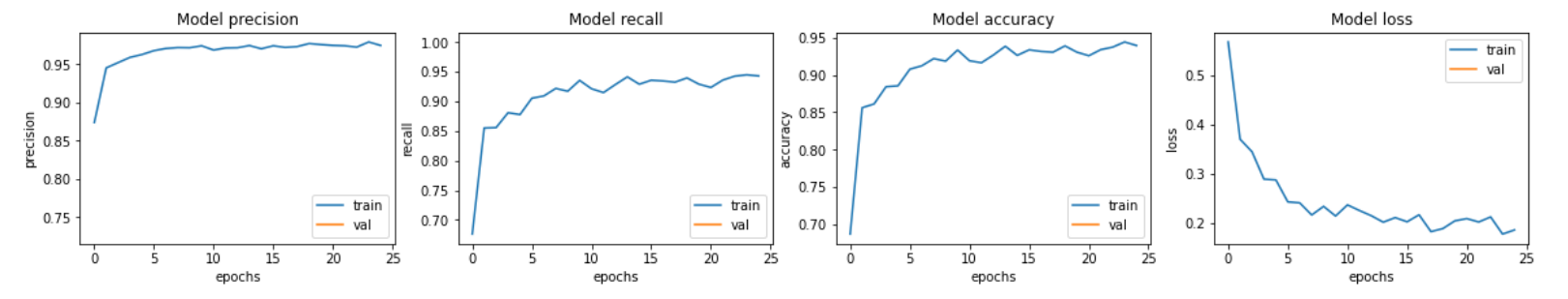 validation 데이터셋의 loss, accuracy, precision, recall 결과는 제대로 생성되어 그래프도 아래와 같이 원하는대로 그려졌다.
