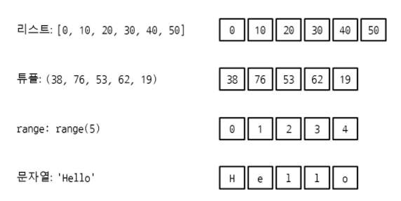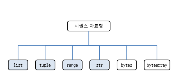 리스트, 튜플, range, 문자열이 모두 시퀀스 자료형에 해당한다.