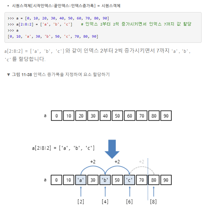 슬라이스는 인덱스 증가폭을 지정하여 인덱스를 건너뛰면서 값을 할당할 수도 있다.
