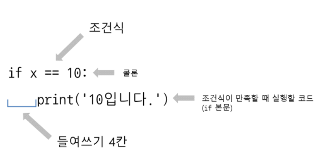 if 조건식 : 의 형식으로 사용되며 조건식이 참일 때 실행될 코드는 아래 칸에서 들여쓰기를 4칸 한 후 작성되어야 한다.
