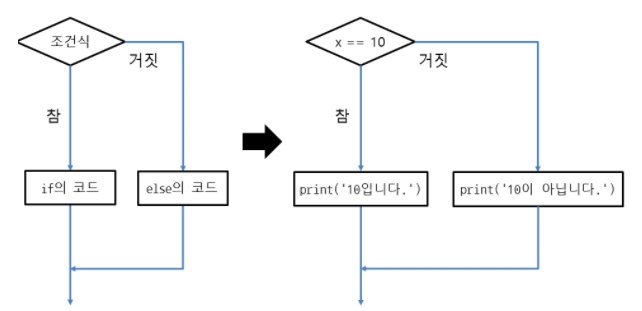 if 조건문이 참이면 if의 실행 코드가 실행되고 조건문이 거짓이면 else의 코드가 실행되는 흐름을 위의 그림과 같이 간략하게 나타낼 수 있다.