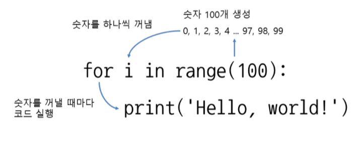 for문은 range에 반복할 횟수를 지정하고 앞에 in과 변수를 입력한다. 끝에는 : (콜론)을 꼭 붙여야 한다.