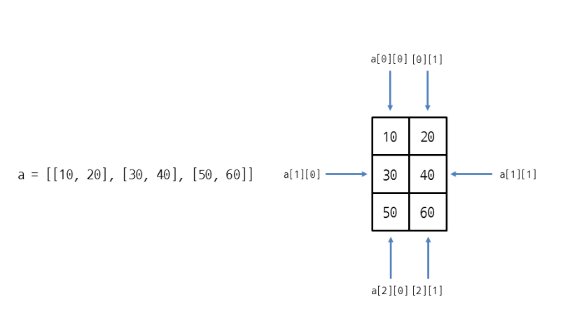 2차원 리스트의 요소에 접근하거나 값을 할당할 때는 리스트 뒤에 [ ](대괄호)를 두 번 사용해서 [ ] 안에 세로(row) 인덱스와 가로(column) 인덱스를 지정한다.