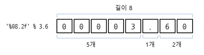 '%08.2f' % 3.6을 출력했을 때 '00003.60'이 나오는 건 잘 보면 3 앞에 0이 7개가 아니라 4개만 붙어 있습니다. 실수는 숫자 개수에 정수 부분, 소수점, 소수점 이하 자릿수가 모두 포함되기 때문이다. 따라서 '00003' 5개, '.' 1개, '60' 2개 총 8개가 된다.