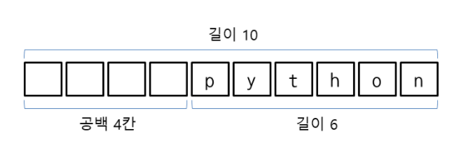 - rjust : 문자열을 지정된 길이로 만든 후 오른쪽으로 정렬하여 남는 공간을 공백으로 채우는 메서드이다.