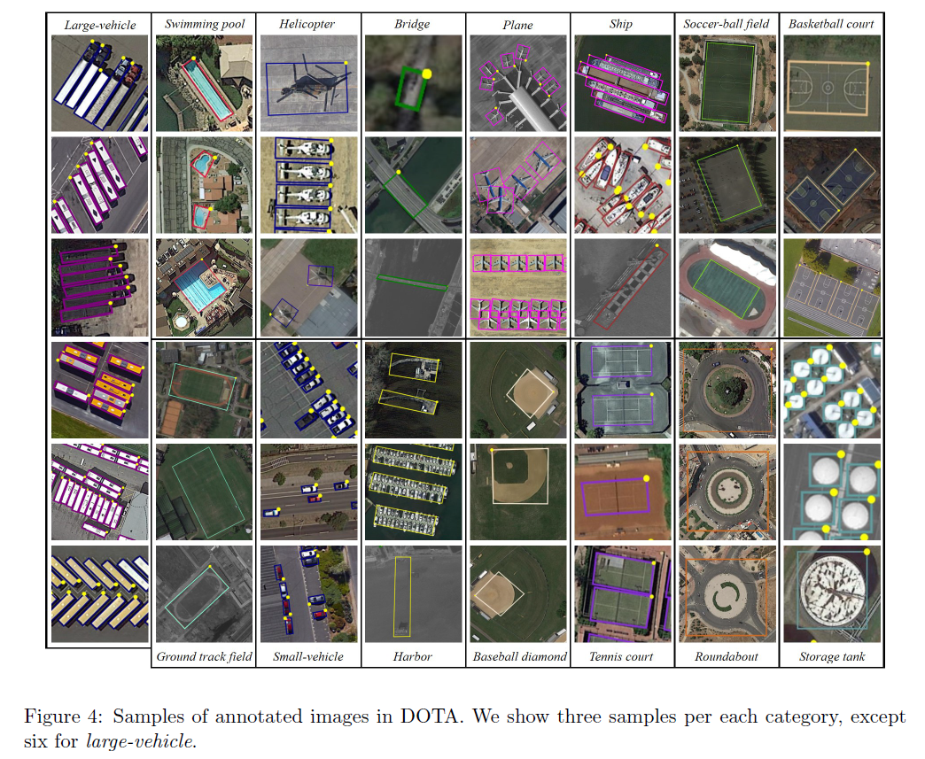 DOTA는 비행기, 선박, 저장 탱크, 야구장, 테니스장, 농구장, 육상장, 항구, 다리, 대형차, 소형차, 헬리콥터, 원형 교차로, 축구장, 농구장으로 총 15개로 주석처리 되었다.