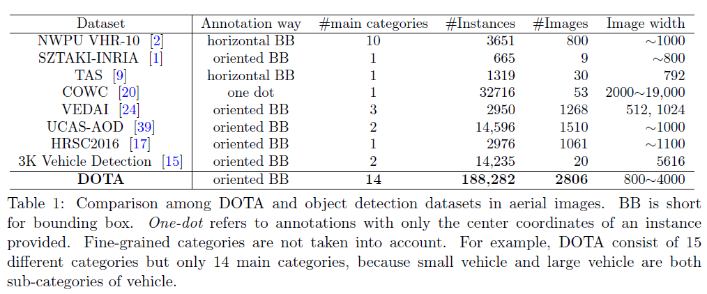 DOTA는 다른 데이터셋과는 달리 object에 적절한 방향의 oriented bounding boxes(OBB)(한국어 직역 - 방향 경계 상자)가 주석 처리가 되어 있다는 것이다. OBB는 object를 더 잘 둘러싸며 혼잡한 object를 서로 구별할 수 있게 한다.