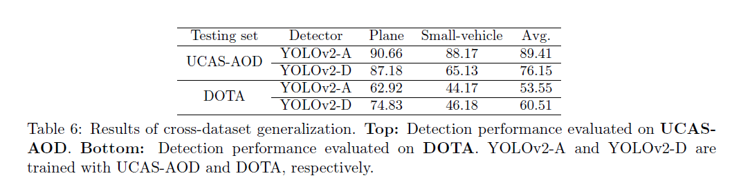 해당 논문에서는 다른 위성 사진의 object detection 데이터셋과 비교하여 비교적 많은 수의 데이터에 대해 데이터셋 간의 일반화를 수행하기 위해 UCAS-AOD 데이터셋을 선택했다. UCAS-AOD에 대한 공식적인 데이터 분할이 없기 때문에 훈련용 1110과 테스트용 400을 무작위로 선택한 후 모든 실험에 대한 테스트 감지기로 YOLOv2를 선택하고 모든 실측 정보에 대한 HBB 스타일 주석을 선택했다. 입력 이미지 크기는 UCAS-AOD의 원래 이미지 크기에서 960x544로 변경되지만 다른 설정은 변경하지 않았다. 그 결과는 아래 표 6에서 볼 수 있다.