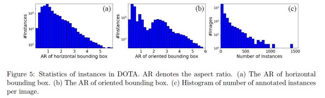 위의 그림에서 종횡 비율이 매우 다르다는 것을 알 수 있으며 데이터셋에는 종횡 비율이 큰 인스턴스 수가 많다는 것도 알 수 있다. 또, 위 그림의 (c)는 DOTA 데이터셋의 인스턴스 수를 보여준다.