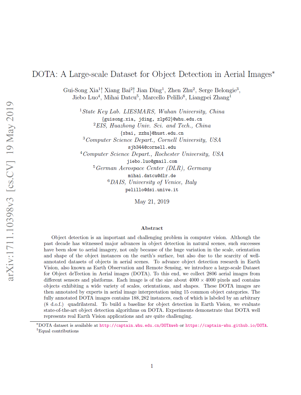 해당 논문에서는 위성 사진의 Earth Vision의 object detection 연구를 진전시키기 위해 위성 이미지의 object detection을 위한 대규모 데이터 세트(DOTA)를 소개한다. 이를 위해 다른 센서와 플랫폼에서 286개의 항공 이미지를 수집하며 각 이미지의 크기는 약 4000x4000픽셀로 다양한 스케일, 방향 및 모양을 나타내는 물체를 포함한다. 이러한 DOTA 이미지는 15개의 공통 object 범주를 사용하여 위성 영상 해석 전문가에 의해 주석이 달린다. 완전한 주석이 달린 DOTA 이미지에는 188개, 282개의 인스턴스가 포함되며, 각 인스턴스는 임의의 사각형으로 레이블이 지정된다. Earth Vision에서 물체 감지 기준을 구축하기 위해 DOTA에서 최첨단 물체 감지 알고리즘을 평가한다.