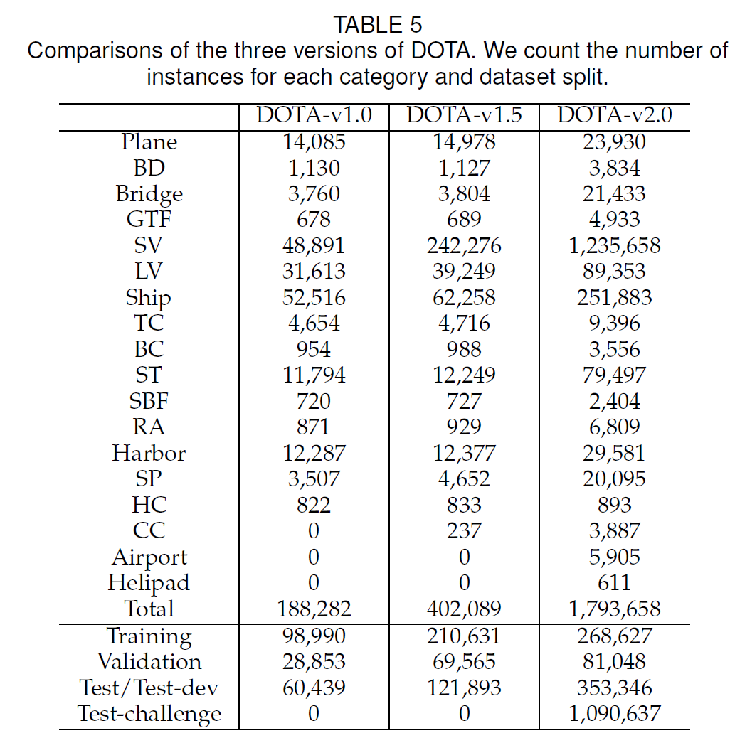 이러한 문제를 해결하기 위해 해당 논문에서는 DOTA의 예비 버전인 DOTA-v1.0을 DOTA-v2.0으로 확장한다. DOTA-v2.0은 18개의 공통 카테고리에서 OBB로 주석을 단 약 180만개의 object instance들을 포함하고 있다. 해당 논문은 알고리즘 개발과 DOTA와의 비교를 용이하게 하기 위해 위성 이미지에서 oriented object detection을 지원하는 HBB 및 OBB를 모두 사용하여 코드 라이브러리를 구축하고 총 10개의 알고리즘과 각각 다르게 설계된 70개 이상의 모델을 평가한다. 향후 연구를 위하여 속도 및 정확도를 분석하여 위성 이미지에서 모듈 설계 및 매개 변수 설정을 탐색한다.