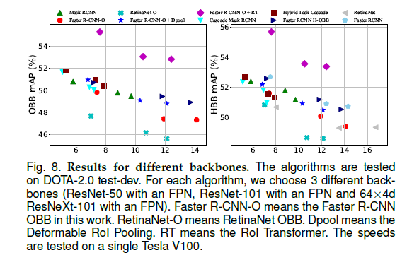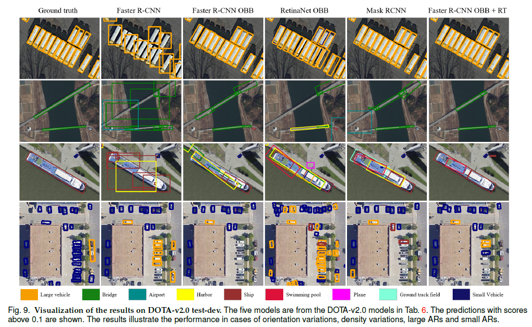 위의 Figure9에서 Faster R-CNN, Faster R-CNN OBB, RetinaNet OBB, Mask R-CNN, Faster R-CNN OBB + RoI Transformer 성능을 비교하여 나타내고 있다.