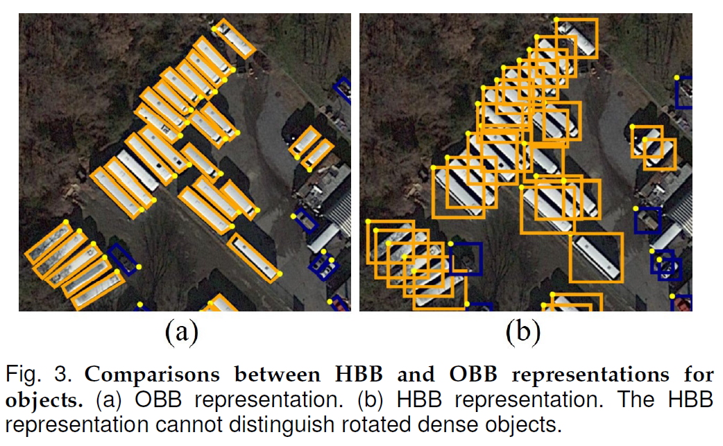 하지만 Figure3에서 보면 HBB는 모여있는 oriented object를 구별할 수 없다. 이런 경우 기존 NMS 알고리즘은 실패하게 된다.