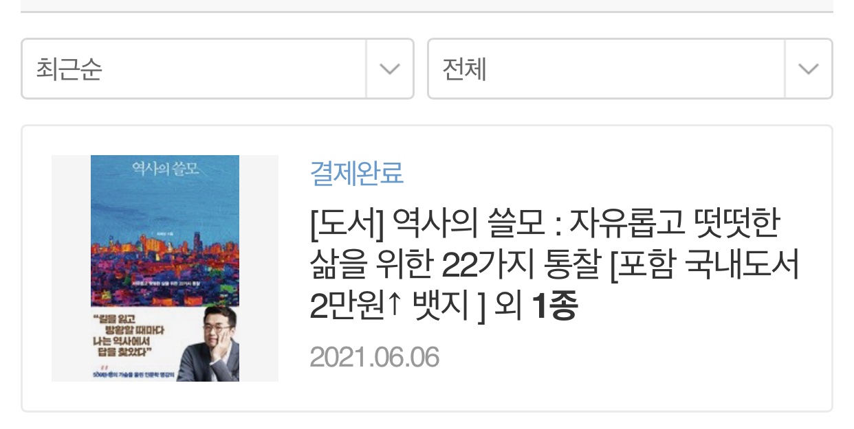1급 합격하면 최태성 강사님이 역사의 쓸모를 사서 읽어보라고 하는데 저번 50회 때는 불합격이라 책을 살 생각도 안했는데, 이번에는 비록 아쉽게(? 2급이지만 그래도 합격은 합격이니까 역사의 쓸모를 샀다 ㅋㅋㅋ