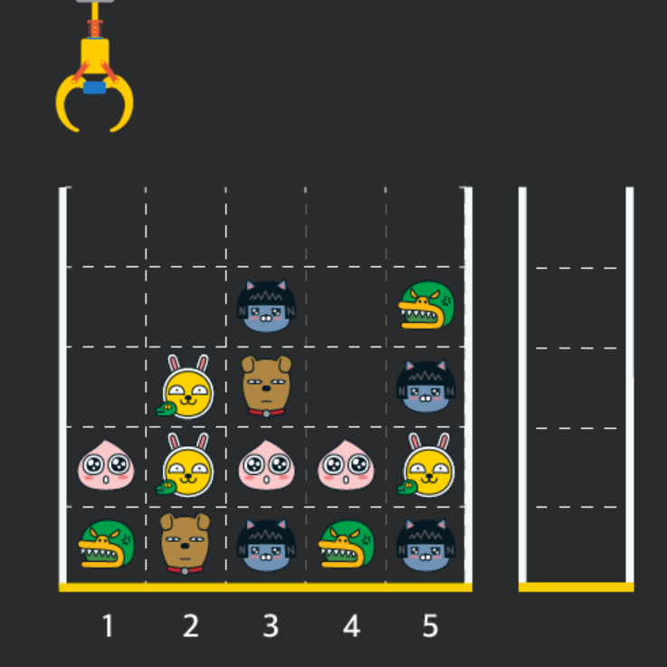 게임 화면은 "1 x 1" 크기의 칸들로 이루어진 "N x N" 크기의 정사각 격자이며 위쪽에는 크레인이 있고 오른쪽에는 바구니가 있습니다. (위 그림은 "5 x 5" 크기의 예시입니다). 각 격자 칸에는 다양한 인형이 들어 있으며 인형이 없는 칸은 빈칸입니다. 모든 인형은 "1 x 1" 크기의 격자 한 칸을 차지하며 격자의 가장 아래 칸부터 차곡차곡 쌓여 있습니다. 게임 사용자는 크레인을 좌우로 움직여서 멈춘 위치에서 가장 위에 있는 인형을 집어 올릴 수 있습니다. 집어 올린 인형은 바구니에 쌓이게 되는 데, 이때 바구니의 가장 아래 칸부터 인형이 순서대로 쌓이게 됩니다.