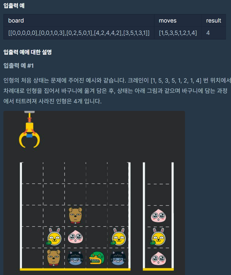 게임 화면의 격자의 상태가 담긴 2차원 배열 board와 인형을 집기 위해 크레인을 작동시킨 위치가 담긴 배열 moves가 매개변수로 주어질 때, 크레인을 모두 작동시킨 후 터트려져 사라진 인형의 개수를 return 하도록 solution 함수를 완성해주세요.