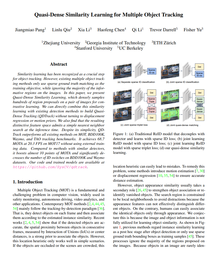 Quasi-Dense Similarity Learning for Multiple Object Tracking, Jiangmiao Pang, et al., 2021을 읽고 요약한 글입니다.