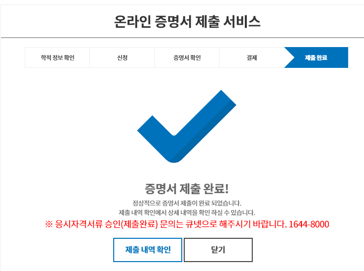 수수료 결제까지 마쳤다면 증명서 제출 완료 창이 뜬다.