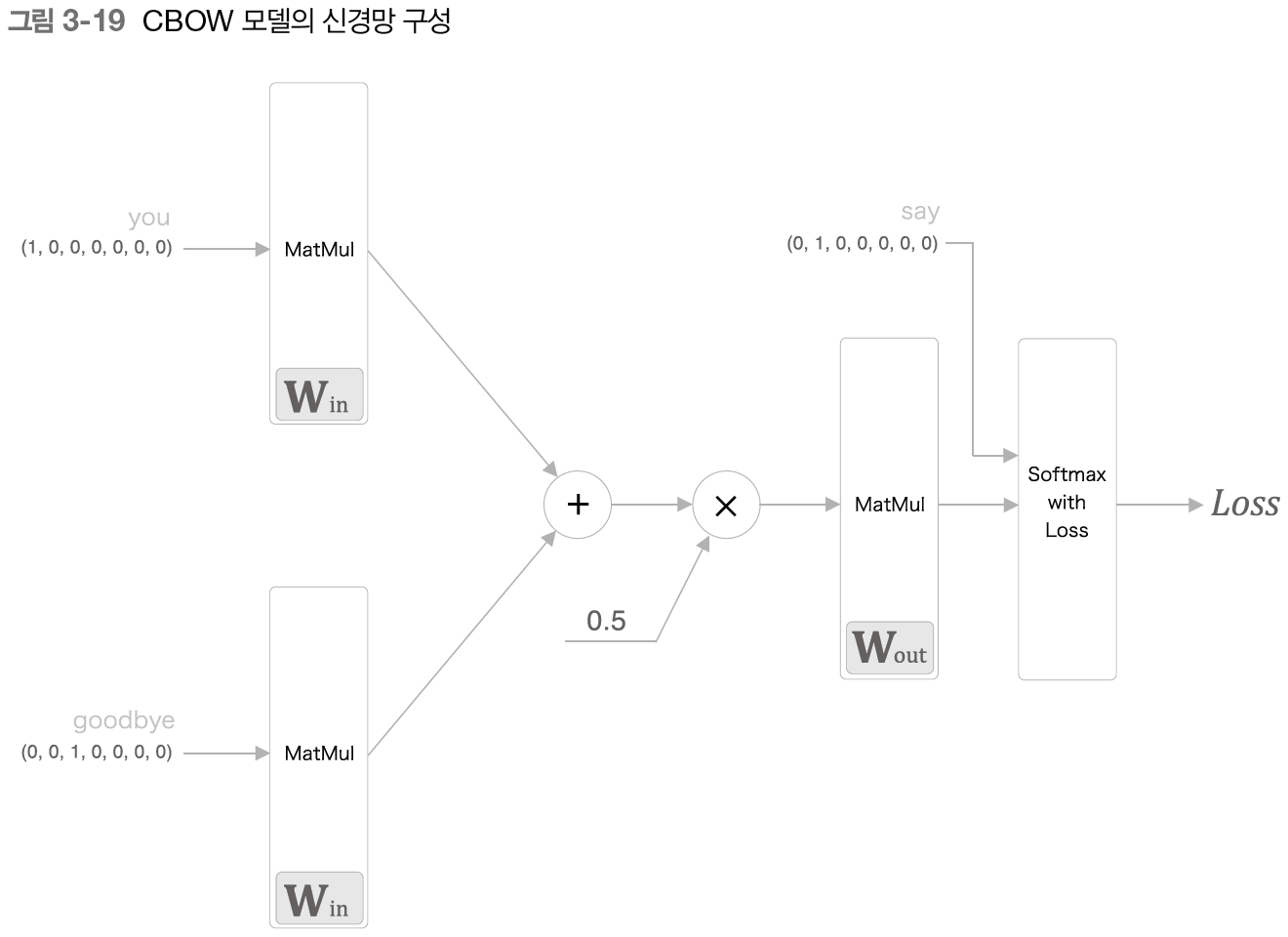 위 그림에서 알 수 있듯이 CBOW 모델의 가장 앞단에는 2개의 MatMul 계층이 있고 이어서 두 계층의 출력이 더해진다. 더해진 값에 0.5를 곱하면 평균이 되며 이 평균이 은닉층 뉴런이 된다.
