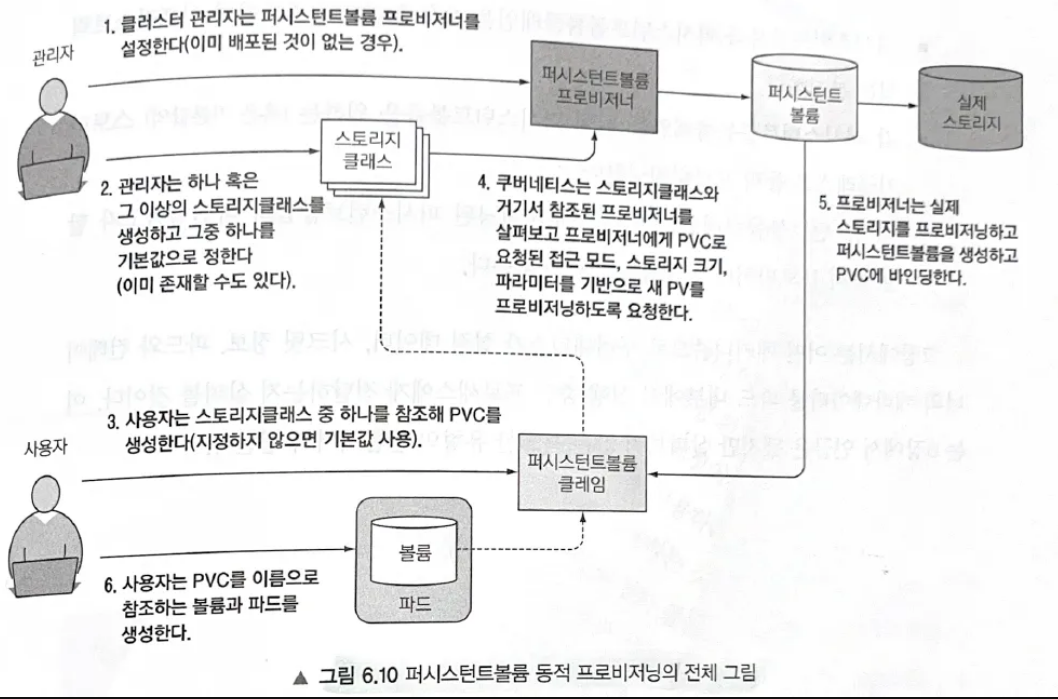 다행히 쿠버네티스는 퍼시스턴트 볼륨의 동적 프로비저닝을 통해 이 작업을 자동으로 수행할 수 있음.