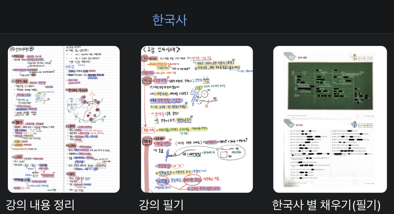 1회독은 큰별쌤 최태성의 별별 한국사 강의를 들으며 교재가 아니라 아이패드에 편하게 강의 내용을 쭉 정리했으며, 2회독은 강의 내용을 필기한 것을 깔끔하게 정리하면서 머릿속에 한번 더 내용을 집어넣었다. 3회독으로는 별별한국사 교재의 필기와 내용 정리를 아이패드로 스캔해서 빈칸을 직접 만들어 강의 내용을 확인하는 식으로 했다.